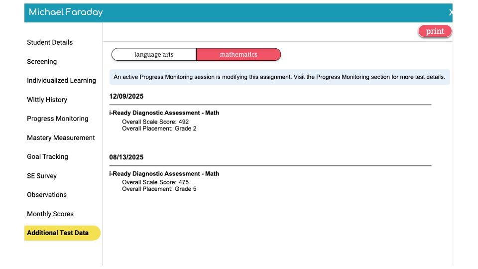 - Select Additional Test Data to view the date the student completed the iReady, their overall scale score, and overall placement.