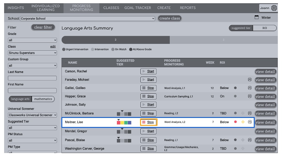 Progress monitoring sessions in Classworks automatically end after 12 weeks. Teachers also have the option to end a session early if an instructional or intervention change is needed, allowing them to more efficiently monitor the effectiveness of instruction.