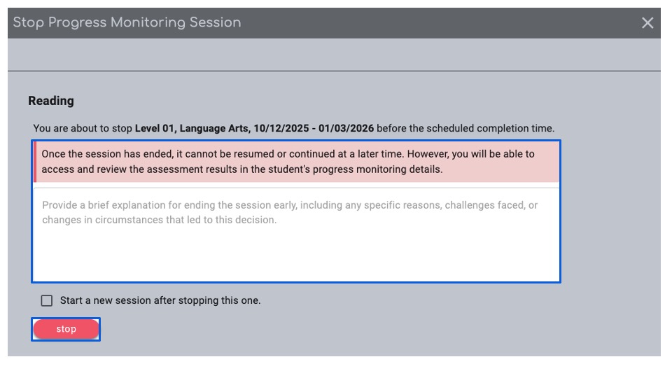 Ended sessions cannot be restarted. A new session can be created at the same level and focused on the same content. All progress monitoring data is retained throughout the school year.