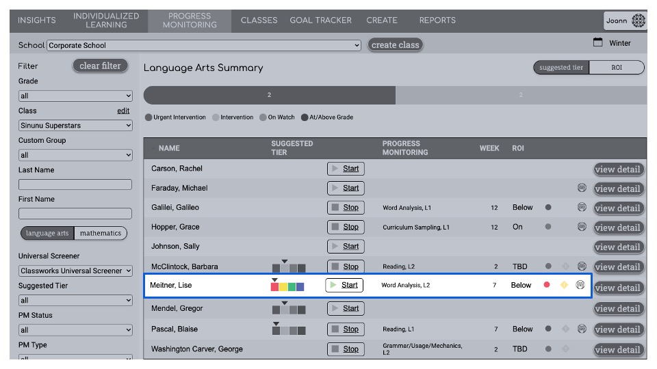 The teacher navigated to the Progress Monitoring screen, located Lise, and clicked Start to begin a Progress Monitoring session.