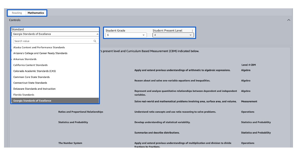 - April is a student in Georgia, so we selected Georgia from the standards dropdown