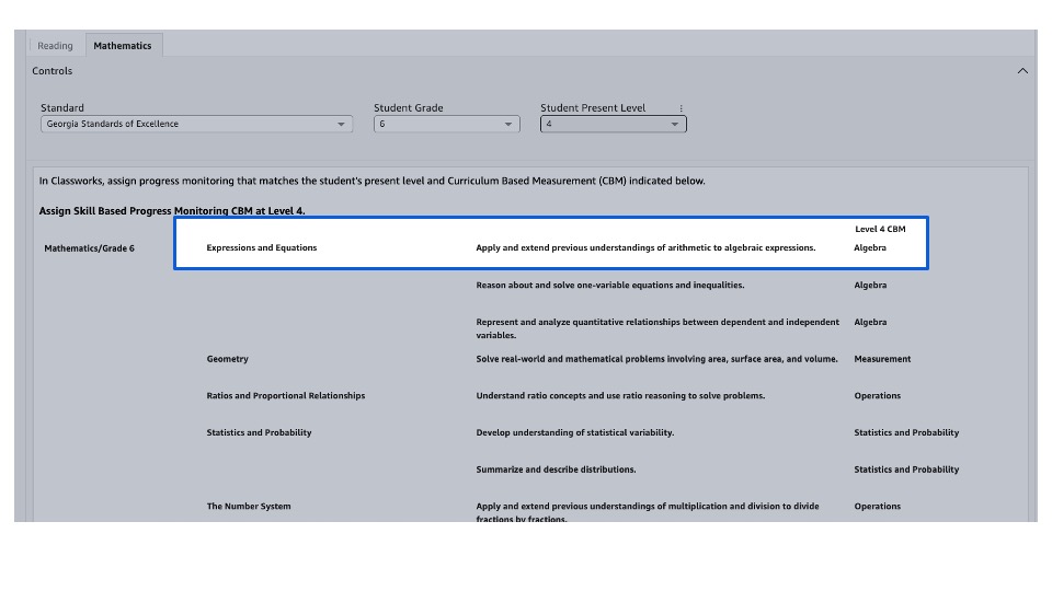 This student, April, is a sixth grader who completed the Universal Screener. She has an IEP goal for mathematics tied to the grade-level standard in Expressions and Equations: