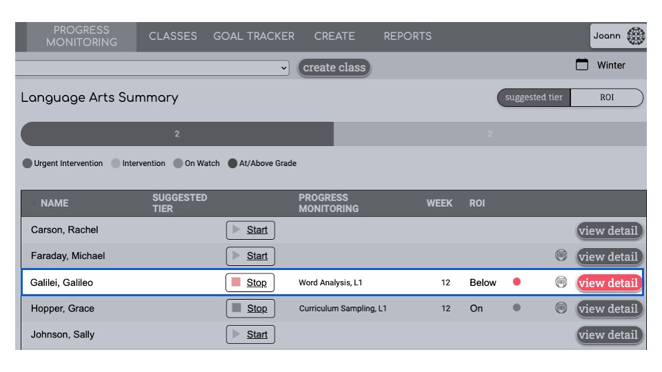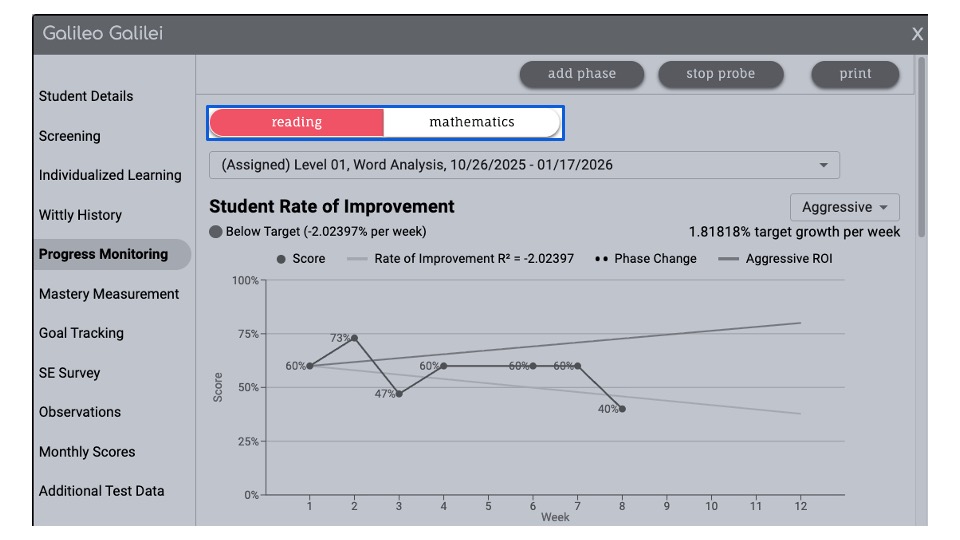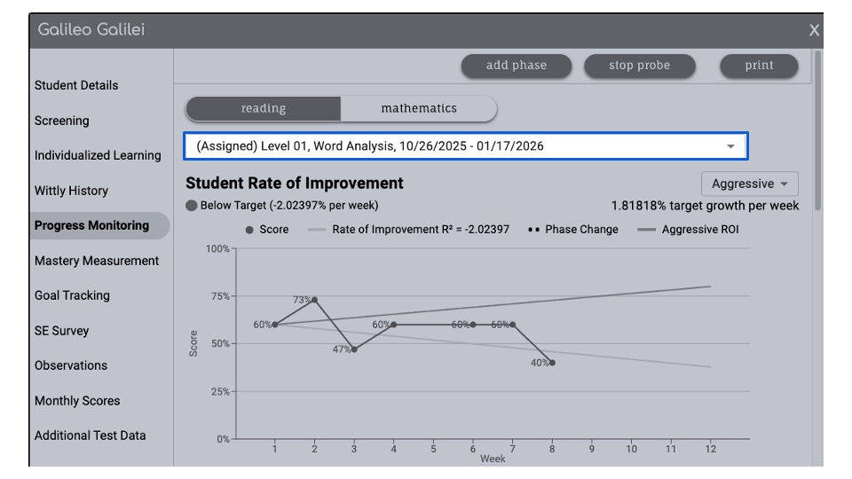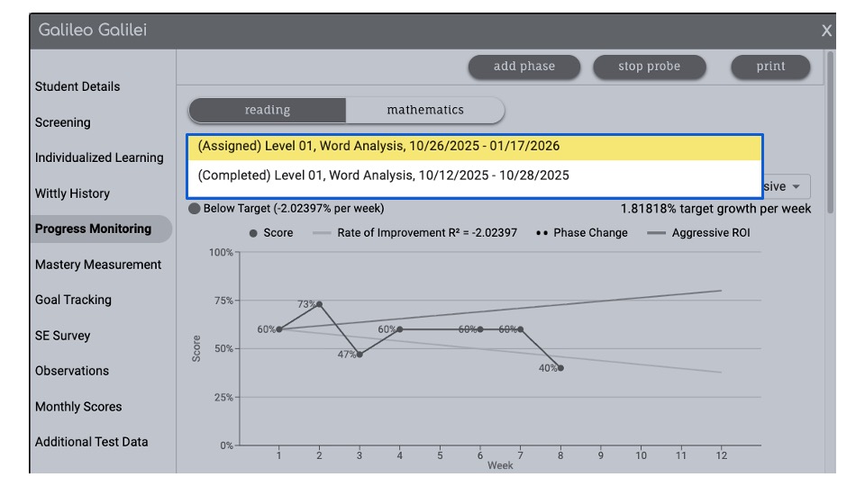 Previously completed progress monitoring sessions can be accessed from the Student Detail Progress Monitoring screen.