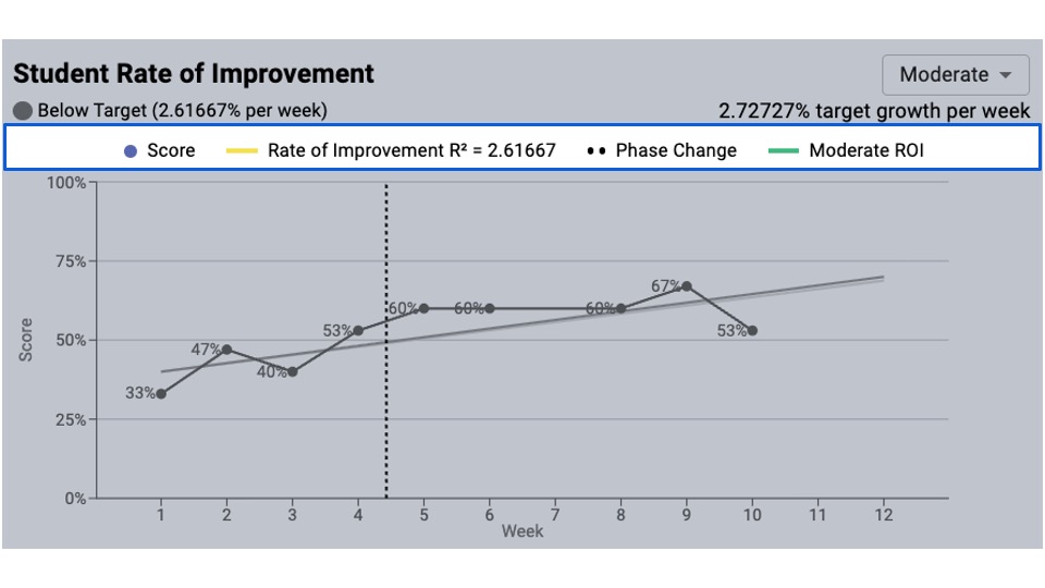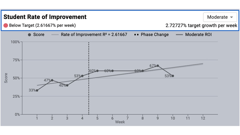 The student's actual rate of improvement is shown on the top left of the graph. This is how many percentage points (on average) the student is increasing their score by each week.