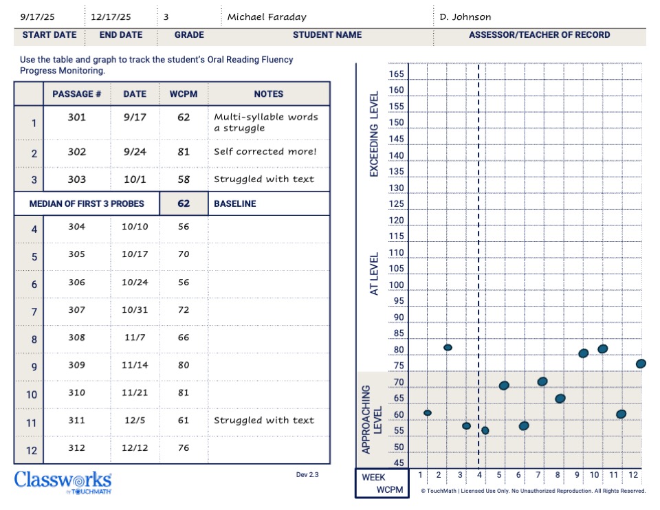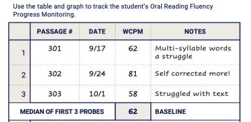 - Note the passage number, date, WCPM and any anecdotal notes and place the student's performance on the graph.