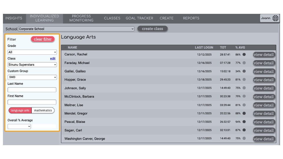 Filters on the Individualized Learning screen narrow the list of students shown to help teachers and staff members monitor student progress.
