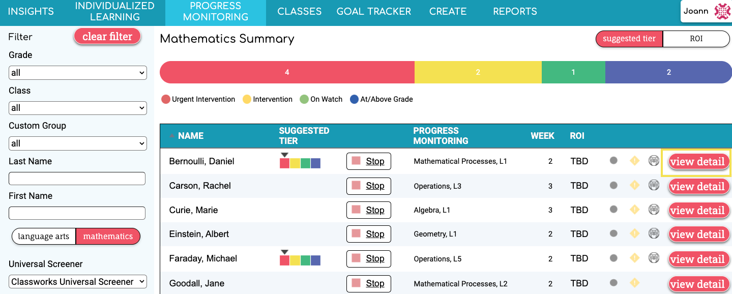 - Navigate to the Progress Monitoring page and use the filters on the left side of the Progress Monitoring page