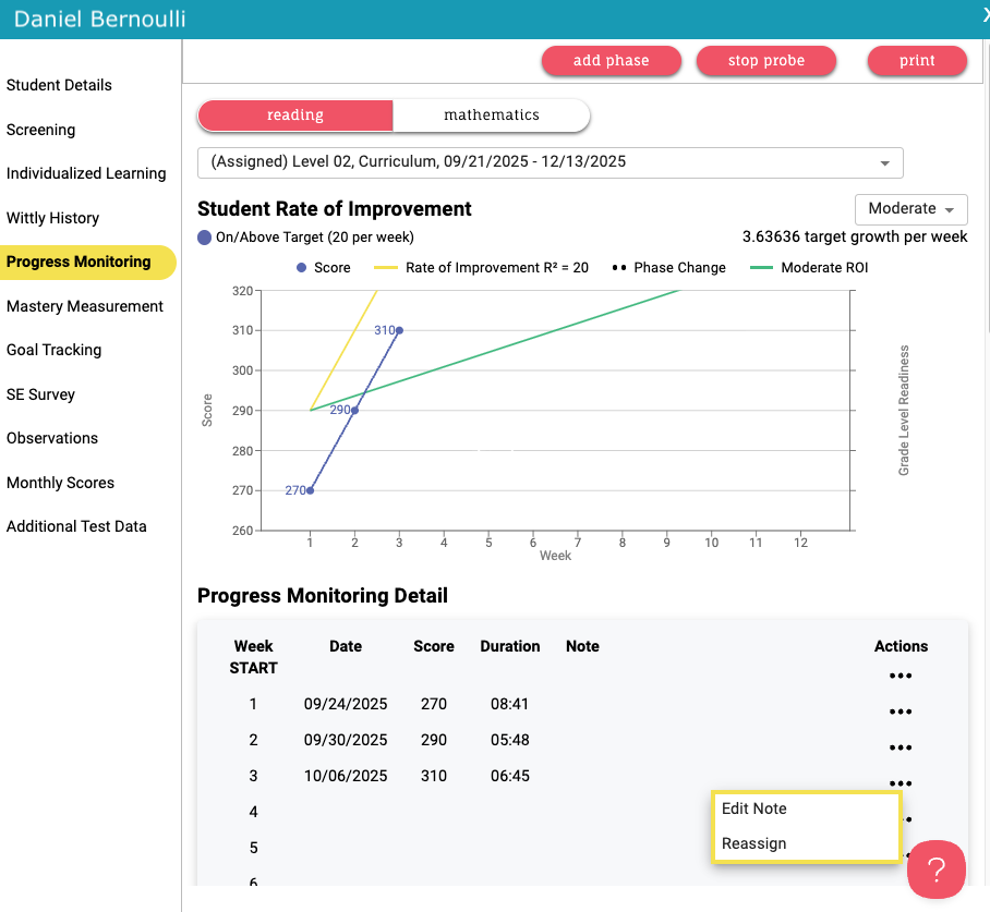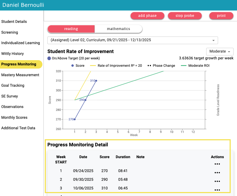 - A new window will open showing the student's active Progress Monitoring session. Look below the graph at the Progress Monitoring Detail table