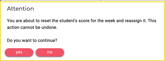- A warning box will appear asking if you are sure you want to remove the existing data for the week, so the student can reassess. If you are sure, click the 'Yes' button.